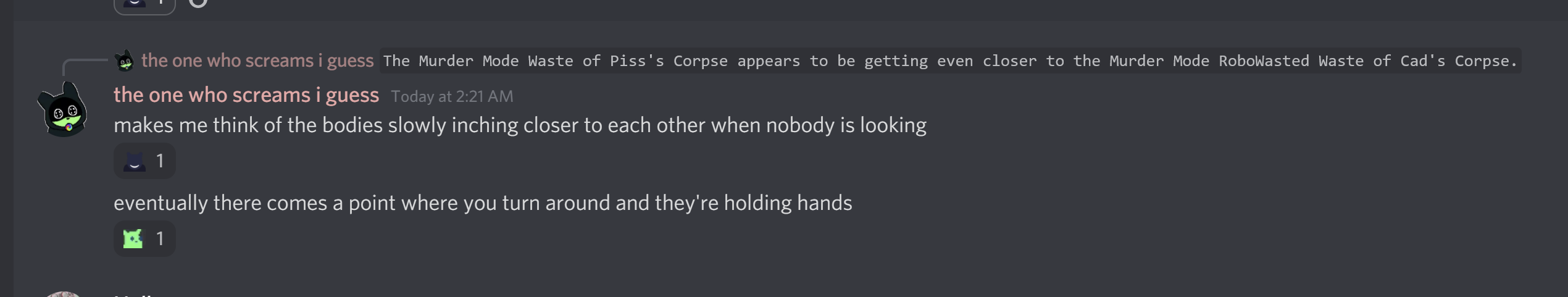 You sit on the floor in your house. A freak accident just occurred, involving murder mode and some wasting, and now two dead bodies lie in front of you. You desperately text your server player and try not to completely lose it. Each time you blink with your eyes full of tears, you could swear one of the corpses moves just slightly towards the other. Too subtle to notice, but when you held your eyes shut for a few seconds, you could definitely spot one of their arms changing positions.