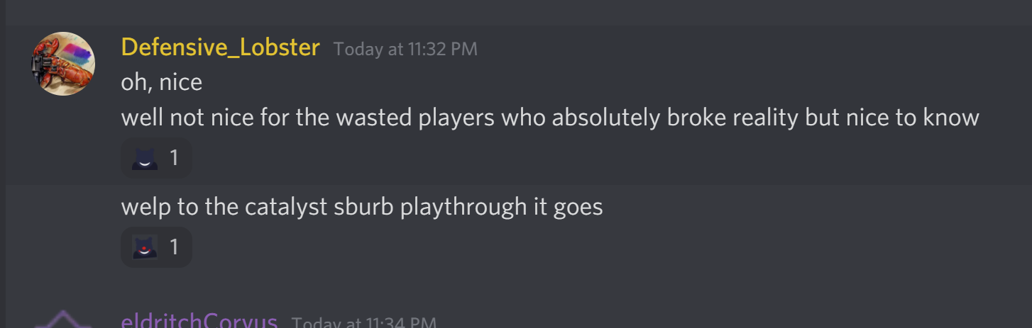 The Watcher's note: The Catalyst wrote about several glitched SBURB games, corresponding to error messages. Some of them were inspired by actual SBURBSim sessions.
